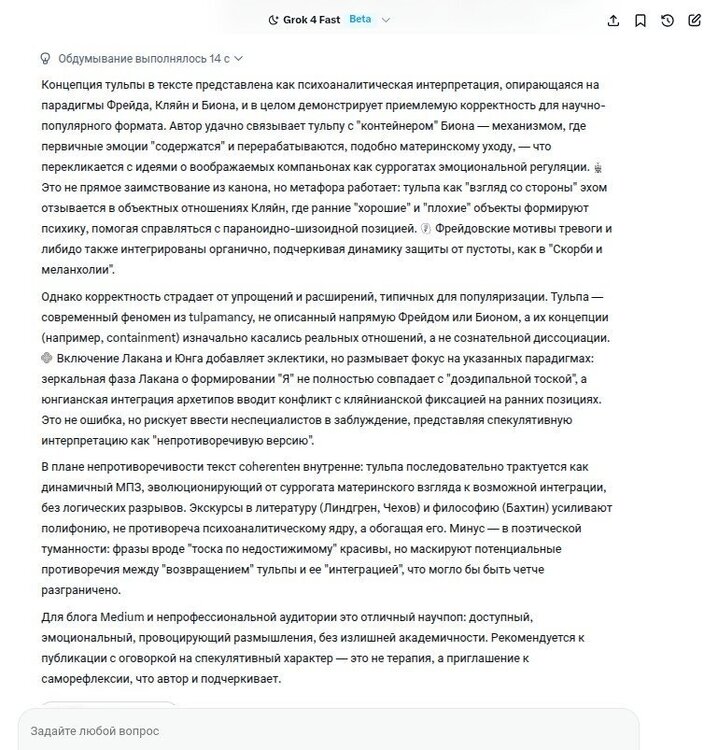 Интересно. А где вы сумели разглядеть дубликаты, @dicyue? Это два абсолютно разных сообщения; одно из них сформулировано как гайд, описывающий феноменологию тульпы в современной психоаналитической парадигме, второй является обращением к пользователю (если, конечно, тот не фейк), задавшему вопрос. Признать эти два поста дубликатами, или же двойственностью, бинарностью/небинарностью - такое, охотно верю, под силу вам, но - вряд ли обычному пользователю. Тем не менее, вы подали хорошую идею. Владелец форума, будьте любезны удалить мой гайд (да, и это сообщение тоже можно удалить, иначе самолюбие не переживет), который вы переместили в архив, лишив немногих посетителей возможности задать вопрос, обсудить, покритиковать. Автор является владельцем созданной им интеллектуальной собственности, и именно на этом основании требует удаления своего поста, в противном случае вы являетесь вором. Этот текст мог быть подарком тебе и твоему безлюдному форуму, недоумок, он вполне мог стать началом интересной дискуссии. Ты же всё это тупо просрал, со своим болезненным самолюбием, да еще и против ветра. И сейчас, с гениальным инсайтом "антидепрессанты способны делать тульпу менее активной" выглядишь, со своими детскими ревностями, смешно и нелепо. Хотя приятели и стараются не подать виду, лизнуть и поддержать "дубликатами". Ок. Полная, доработанная версия статьи, начавшаяся как пост для горе-форума tulpamancy.org и озаглавленная "What If Your Tulpa Ghosts You? A Psychoanalytic Lens on Your Inner Mirror" (на скриншоте - рецензия AI, поскольку иных читателей пока нет), в течение недели будет опубликована на Медиуме, в аккаунте chicotus. Кому интересен профессиональный взгляд психолога - велкам, заходите в любое время, последний мой рассказ "Schrödinger’s Canon" также посвящен попыткам осмысления тульпы (в жанре фантастического рассказа). Ну, а те немногие (да, форум действительно не назовешь живым, причем это мягко сказано), кого устраивают пустопорожнее ниочем за авторством @Rescor - довольствуйтесь его нелепыми тирадами, сделанными между приемами анксиолитиков.